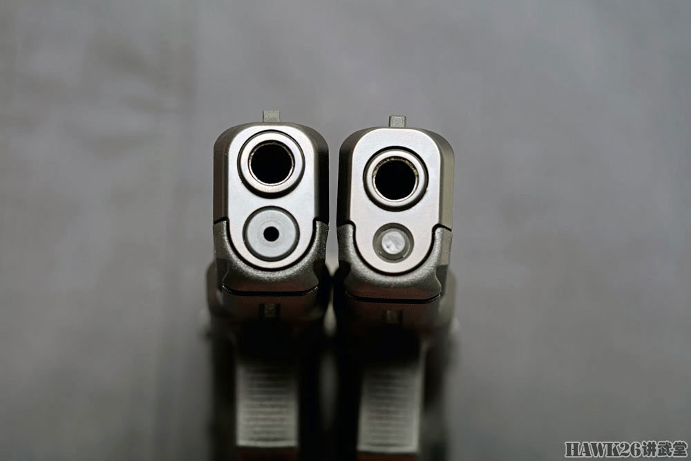 格洛克19(左)与格洛克46(右)的对比,可以看到格洛克46的枪管轴线明显较低。