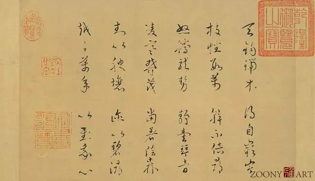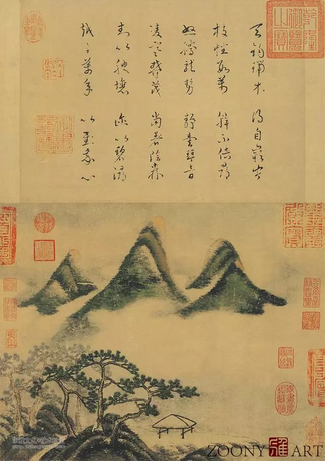 这幅14世纪早期的《春山瑞松图》,传为宋代米芾所作,图中描绘云雾掩映的山林景色,图中白云满谷,远山耸立云端,近处古松数株隐显于雾气中。松下有亭,空无一人。山峦青绿晕染,再加"米点" (亦称"落茄被"),松树笔法细致、严密。用淡墨、淡色表现雾中树木、十分成功,作品描写的中心不是山峰林木,而是山中浮动的云雾。通过云雾表现春山的湿润、静谧和松树的矫健挺拔。