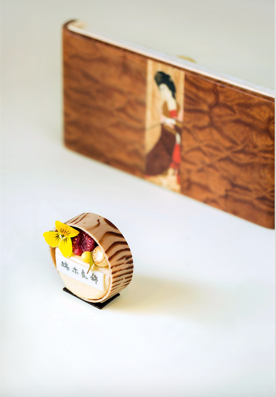 “繁花端木”——木是端木良锦品牌的核心元素,其全线产品以木为主,辅以锦缎与皮革。这款栗子慕斯配朗姆酒巧克力,巧妙地将巧克力演绎成端木良锦“盛唐仕女木作手拿包”上的木纹图样,勾勒出中国古典园林中的月亮门意境,并将可食用小黄花与灵巧的树莓果点缀于慕斯蛋糕之上,馥郁园林跃然眼前。甜品师以甜品造景的技艺令人叹服,也呼应了端木良锦植根古典美学之上的当代设计造诣。慕斯的绵软遇上巧克力片的清脆,栗子的回甘融合朗姆酒的微醺,珠联璧合间味蕾被征服。
