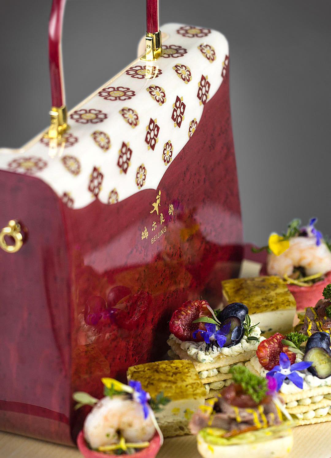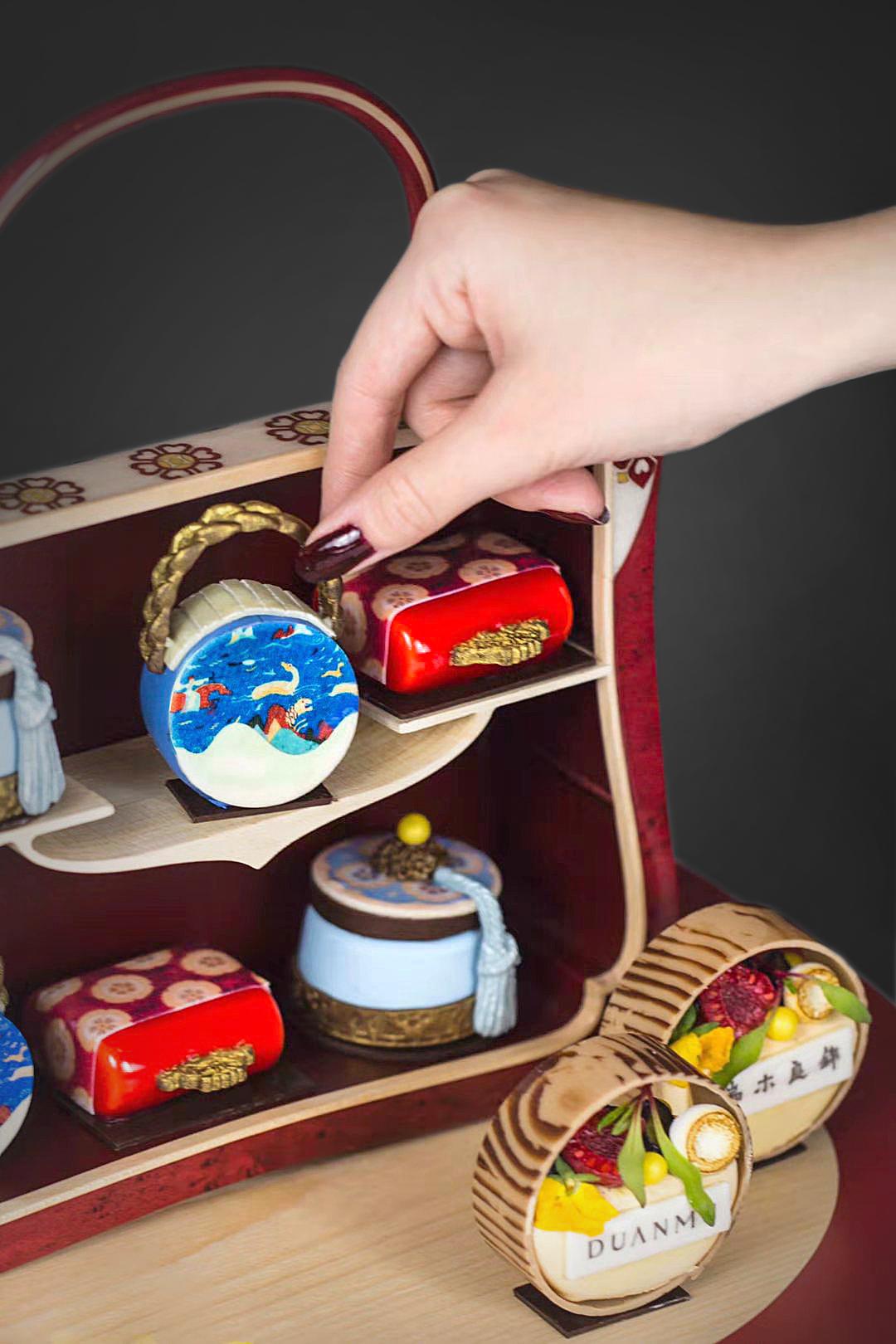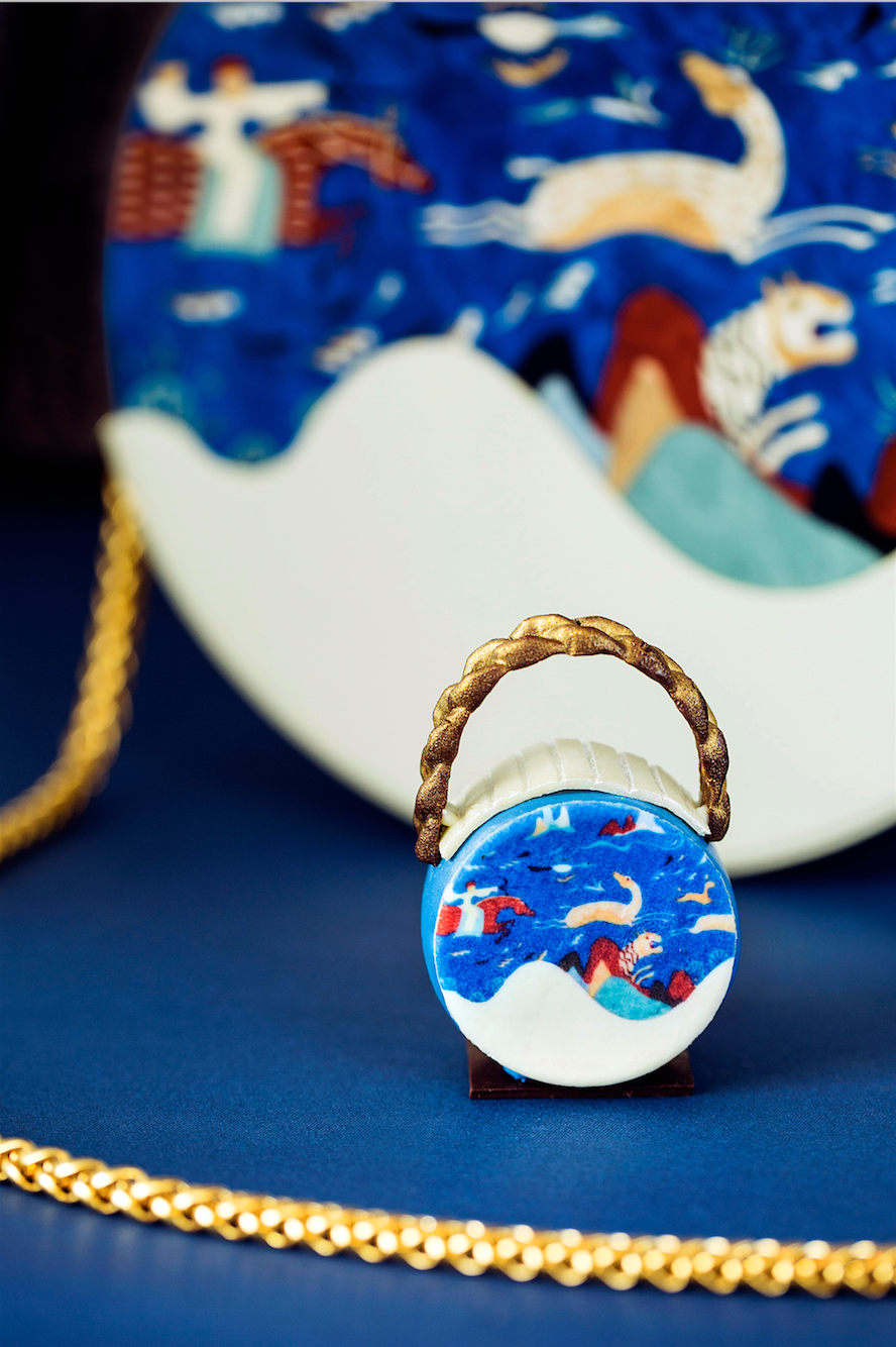 “仙林逐鹿”——青金蓝色的蓝莓芝士蛋糕灵感来源于端木良锦“镶嵌逐鹿纹木作单肩包”,这款花纹充满童趣又古意盎然,集合了汉唐多种元素,有来自汉代画像砖的人物百兽、花草灌木,也有源自唐代敦煌壁画的落英流霞、山峦叠嶂。甜品师的东方美学造诣让这一古老图形穿越千年,跳跃的配色融合了古典美学与当代设计,充满活力,意境灵动;而蓝莓与芝士的经典组合,也与其绝美的外表同样令人惊艳。