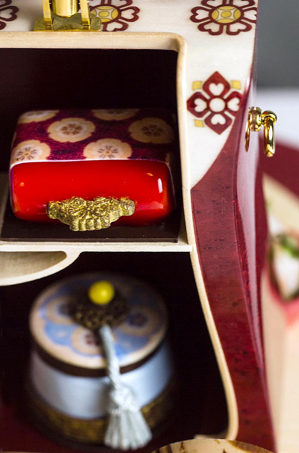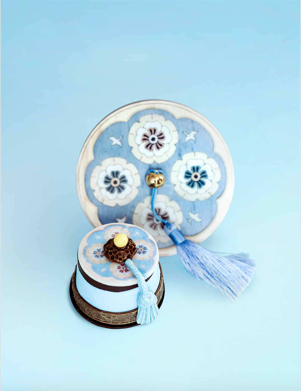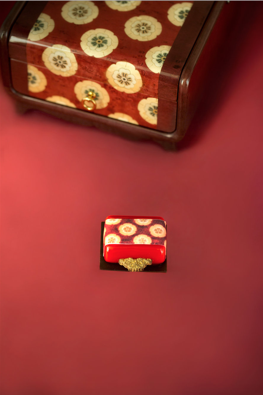 “宝相团花”——榴红色的酸奶油红梅慕斯蛋糕灵感来源于端木良锦“镶嵌宝相团花纹木作珠宝盒”,这款花形源自敦煌壁画,是唐代团花图案的典型,花蕊花瓣均向一侧弯卷,袅袅绽放,动感极佳,宛如置身歌舞升平的大唐盛世;慕斯的香甜与奶油的微酸相互平衡,口感曼妙。