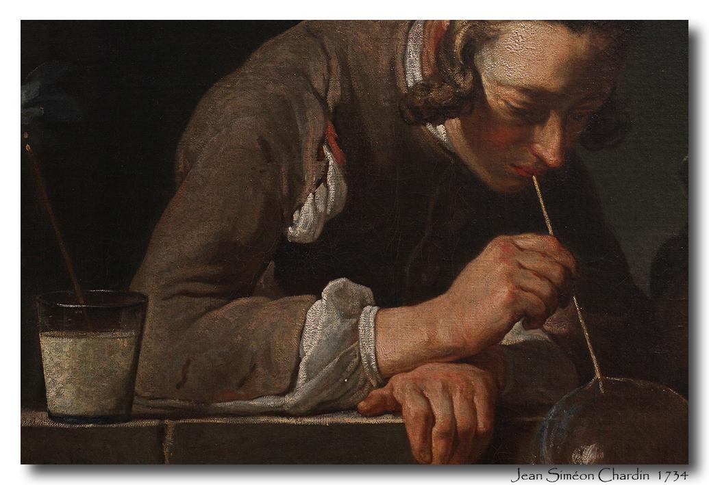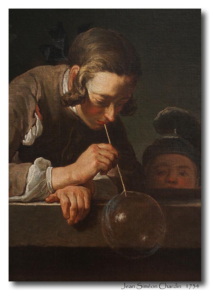 《吹肥皂泡的少年》布面油画,作于1734年,规格61 x 63厘米。该作品现藏于美国纽约大都会艺术博物馆。该作品有不同的后续版本分别藏于美国国家艺术博物馆,美国加州洛杉矶县博物馆。