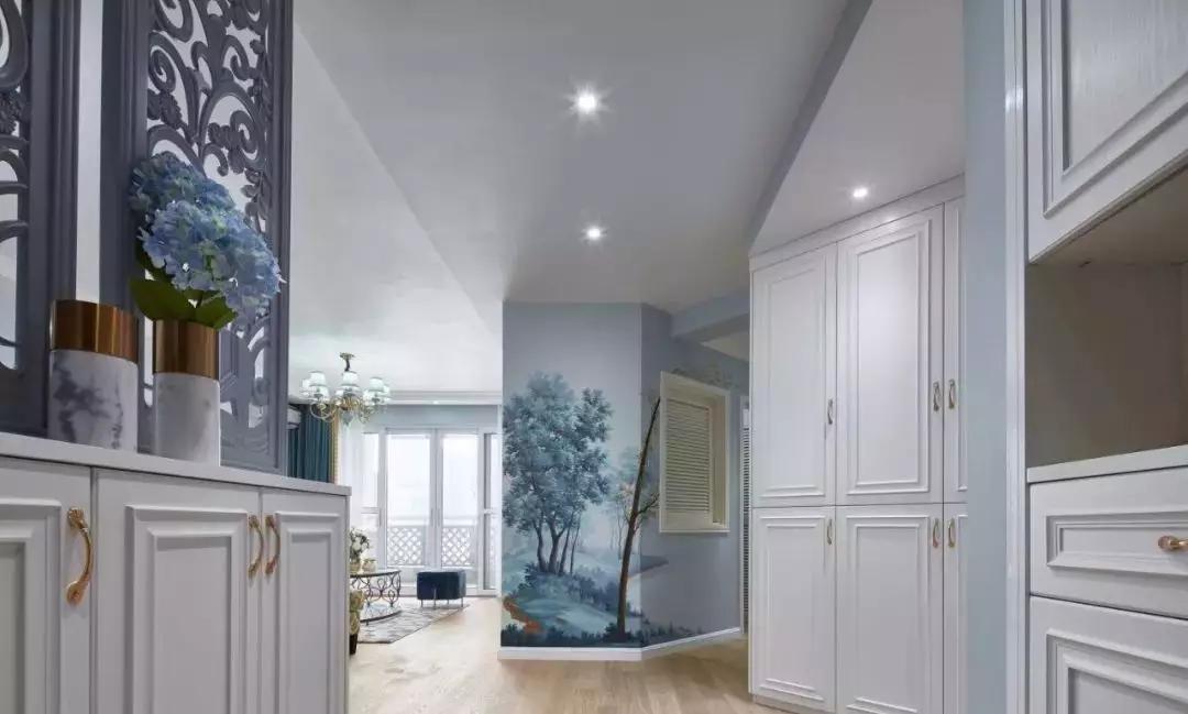 推开大门,映入眼帘的是储物间的手绘墙面,以Tiffany蓝为底色的曲径小道,散发出一种静谧幽美的气息,给人安定感觉的同时又在视觉上得以延伸。