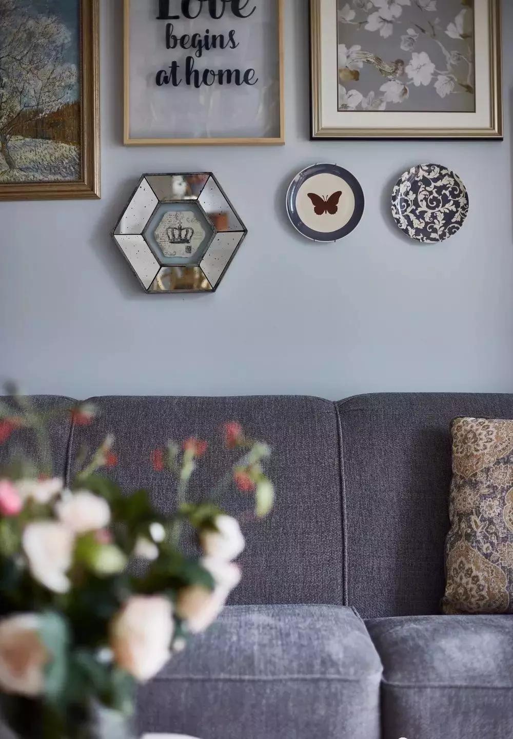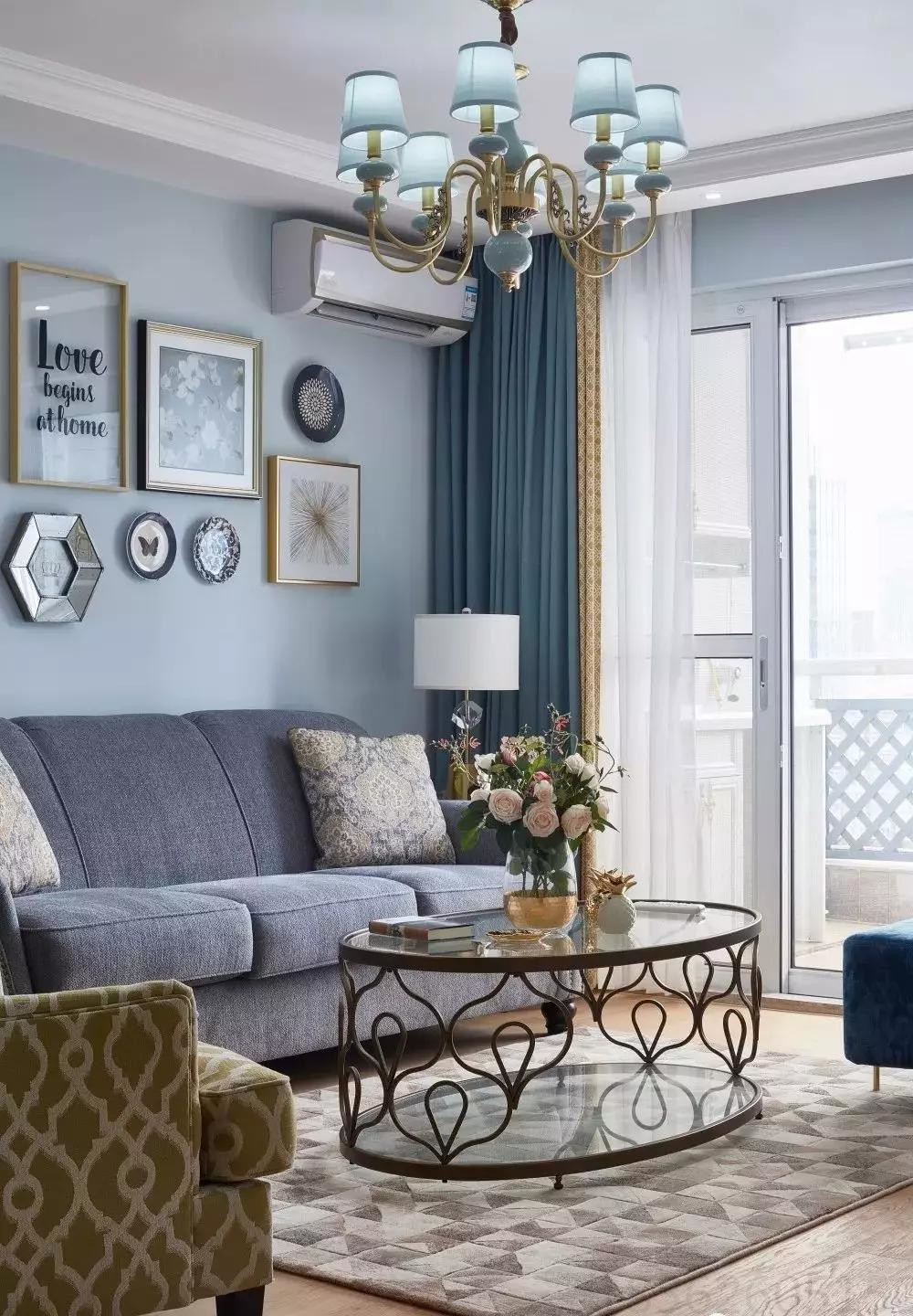 客厅的主灯也选择了蓝色调,与金色的搭配,清新中透着精致感。墙面上不同形态的装饰画,灵动而优美,茶几上的鲜花也是美得动人,带来悠闲惬意的舒适感。