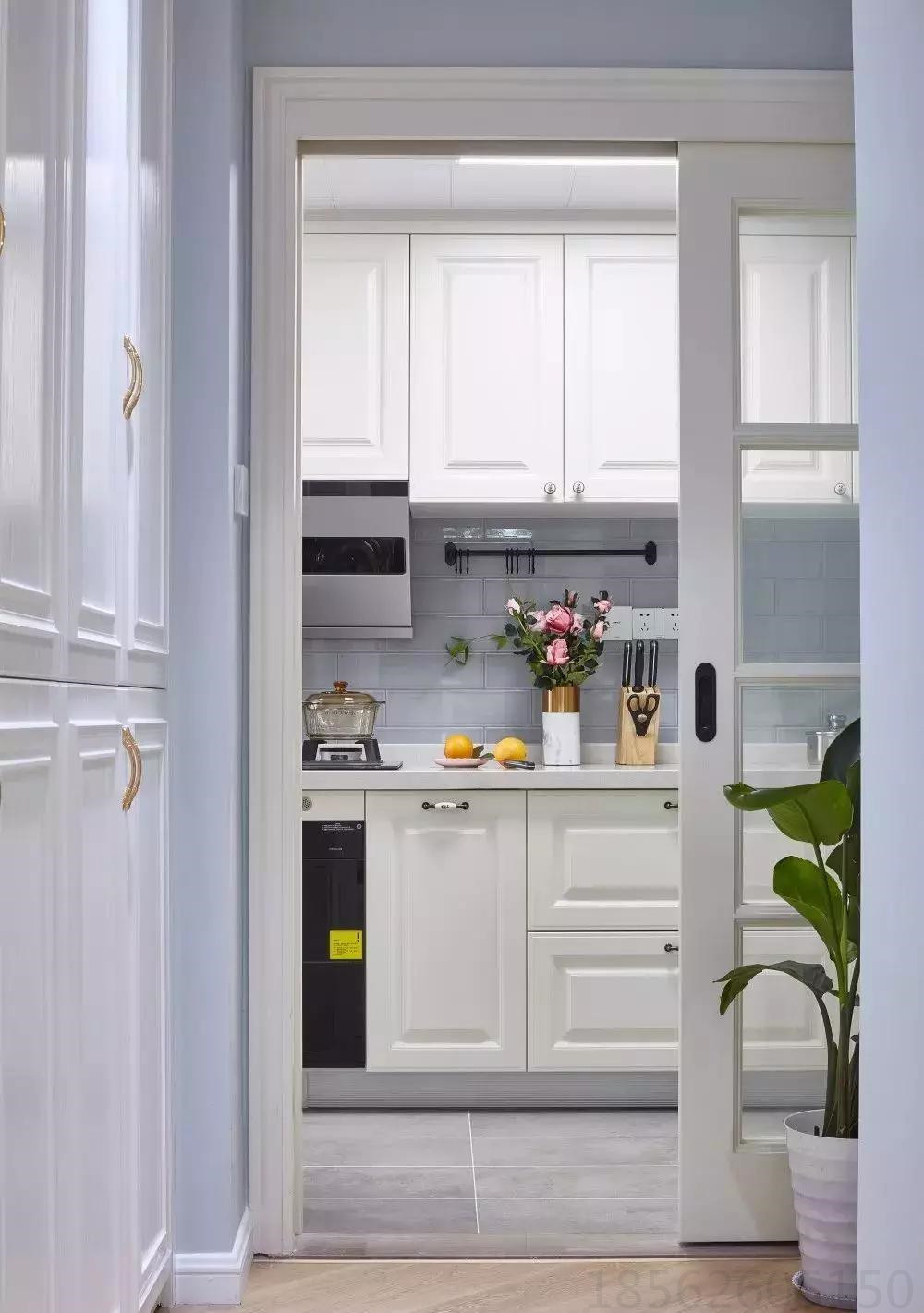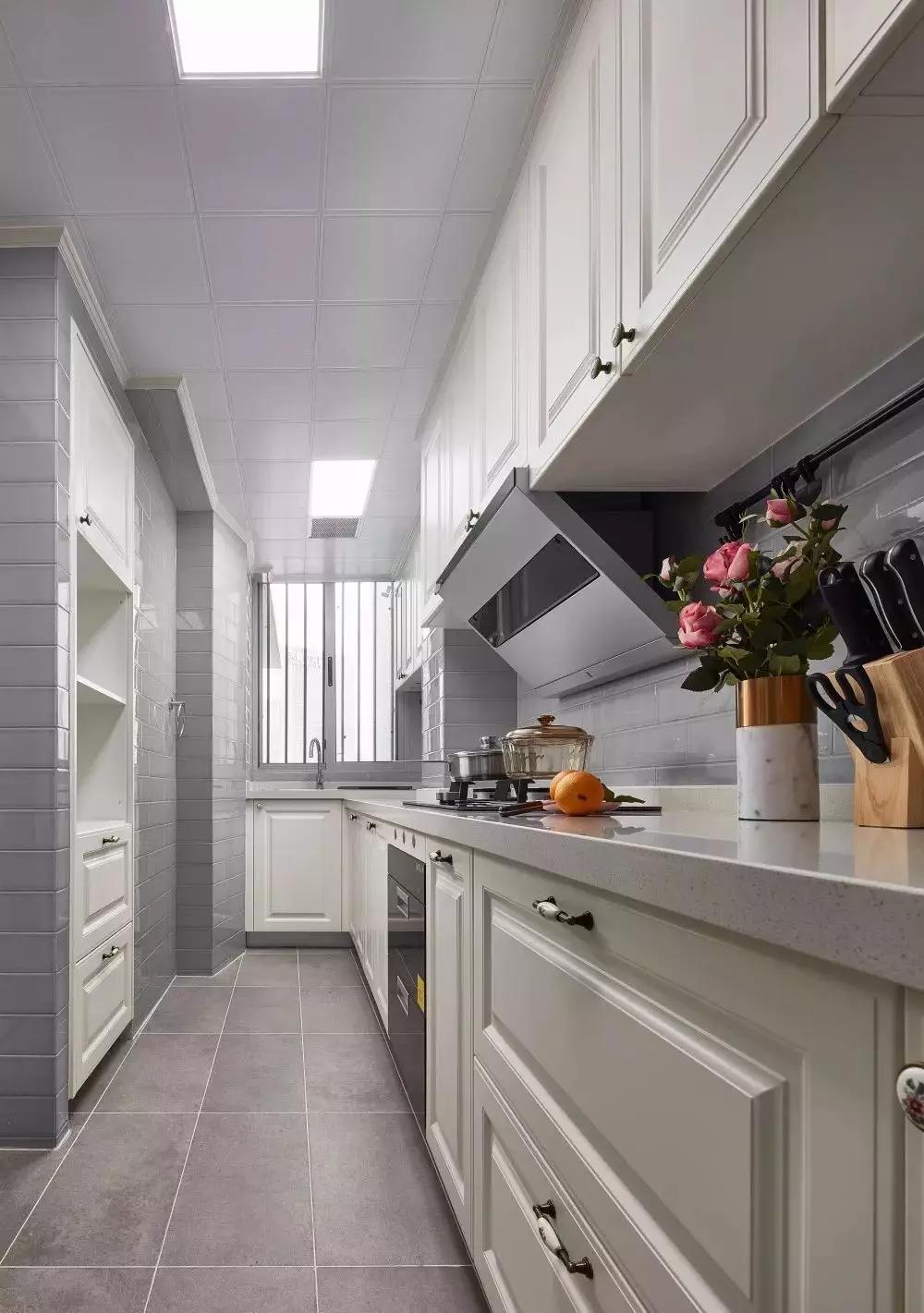 设计师利用墙体的厚度,增设一个储物柜, 在保证空间均衡与视觉效果的情况下把收纳发挥至最大,同时增加一字型厨房的便利性华杰东方装饰集团胶州城市人家。