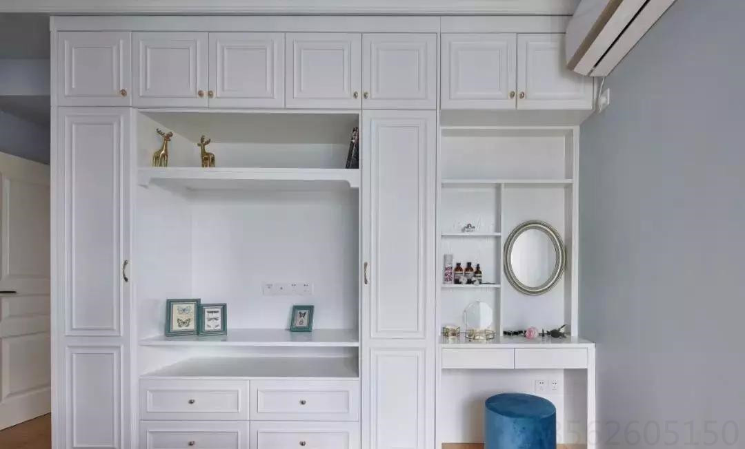 床尾的定制柜集电视柜+衣柜+梳妆台一体设计,实用美观。