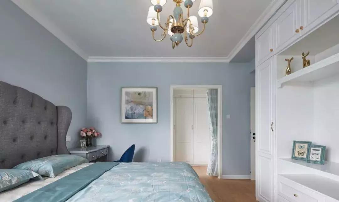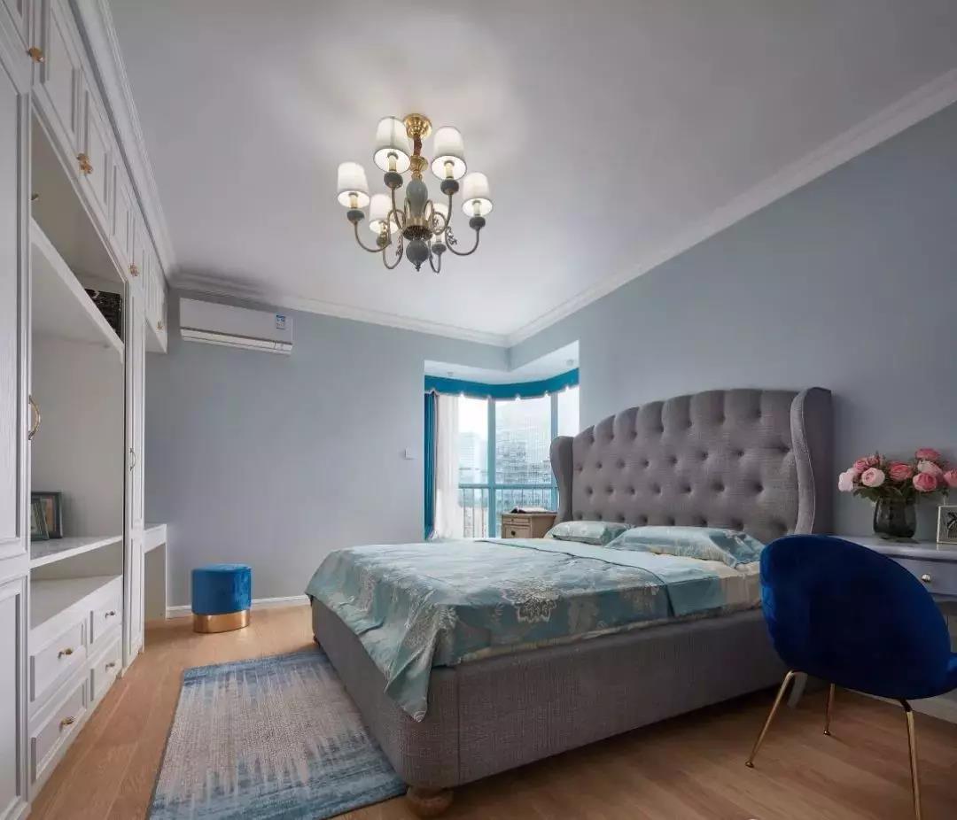 主卧通过色系的延伸,保持空间的连贯性。静谧的蓝色背景墙,洁白的实木柜体,灰色的布艺宫廷床,华杰东方装饰集团胶州城市人家无不是为主卧提供舒适安静的休憩空间。