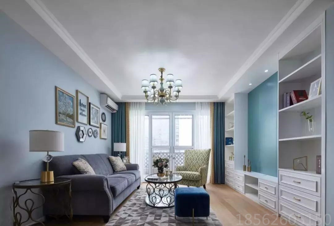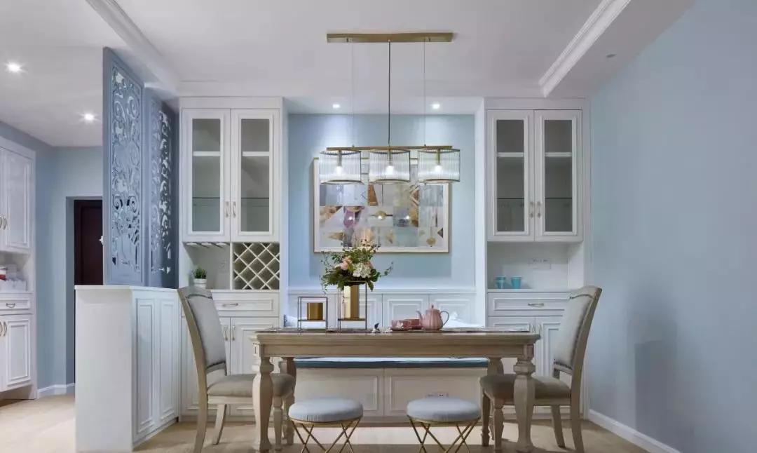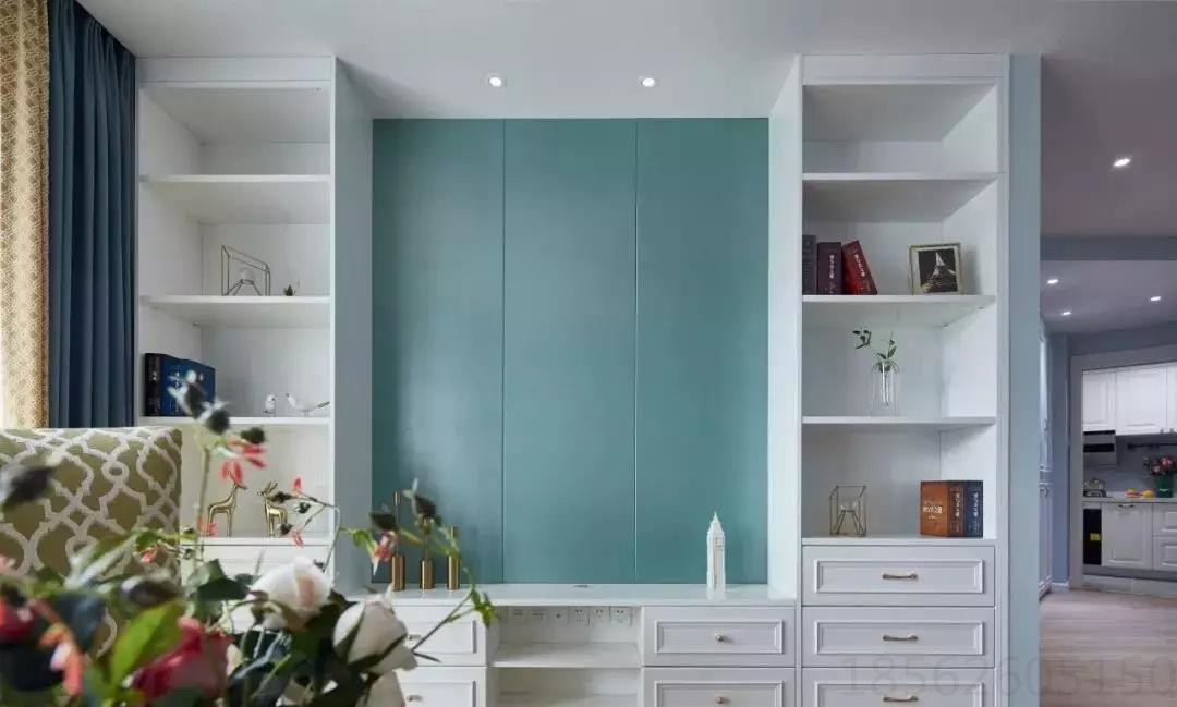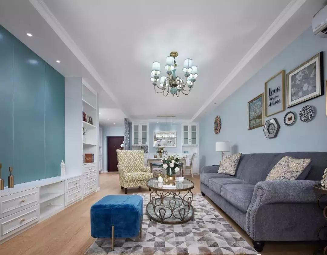 本案是一套面积为138平米的美式风格三居室,色彩选择上以Tiffany蓝和白色为主,配以浅粉色、金属元素饰品,营造出清新浪漫、柔美舒缓的空间氛围,并从细节之处彰显出美式式的精致、高雅。
