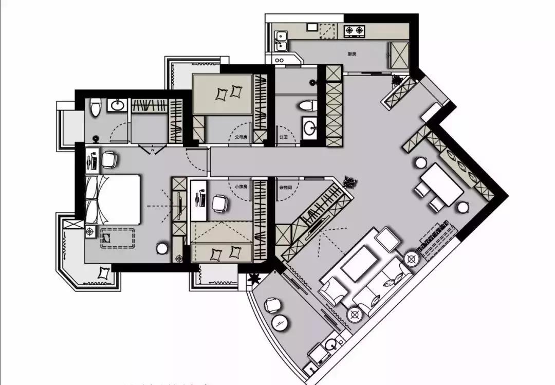 这套房子的户型并不方正,设计师根据业主的需求和户型的优势,在电视背景墙后增加三角型杂物房,增加收纳空间;并将厨房与小阳台相互打通,增设推拉门,让厨房变规整的同时,还原厨房的增加了一排收纳柜。
