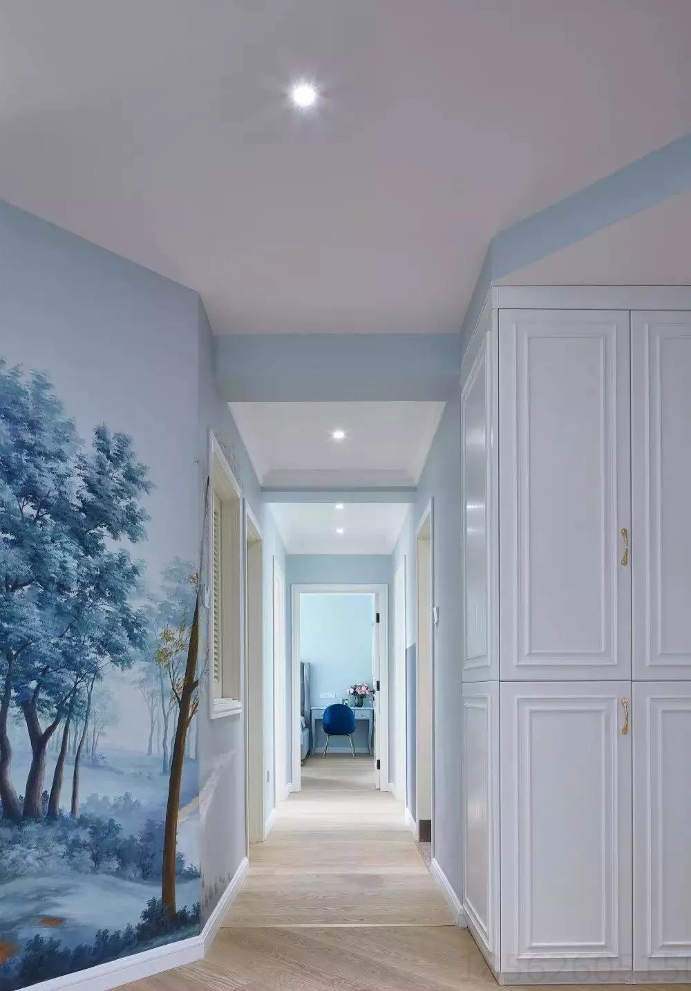 储物间的壁画与蓝色墙体、白色门框相辅相成,渐渐过度到卧室空间。