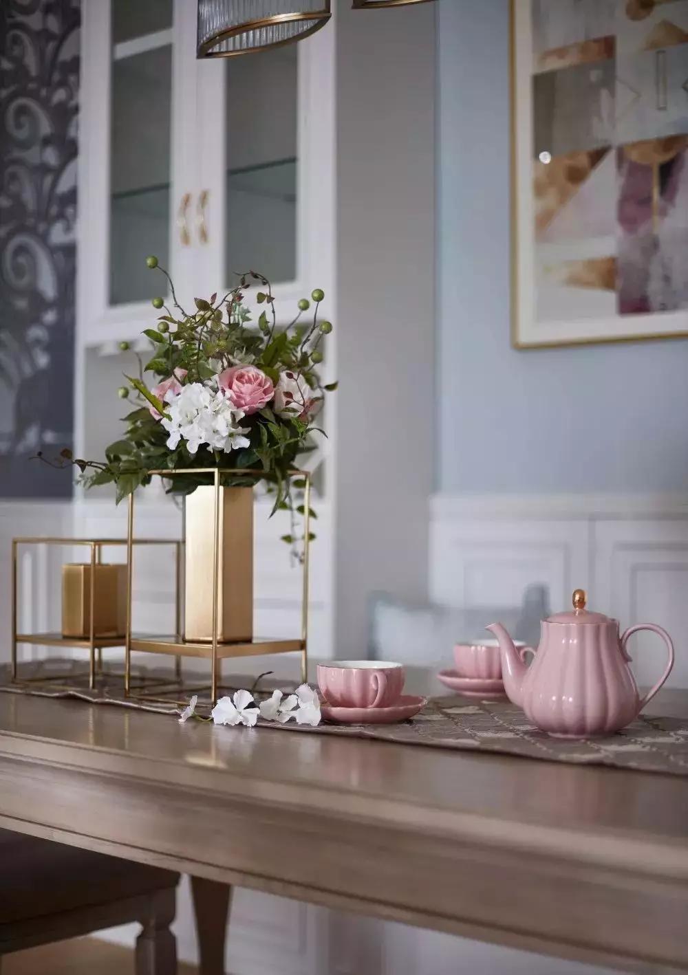 白色和Tiffany蓝是整个客厅的主题色。金属装饰镶嵌在白色与蓝色所赋予的柔和旋涡之中,绽放出一圈圈浪漫、轻奢的涟漪。