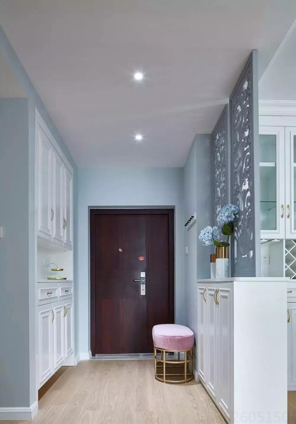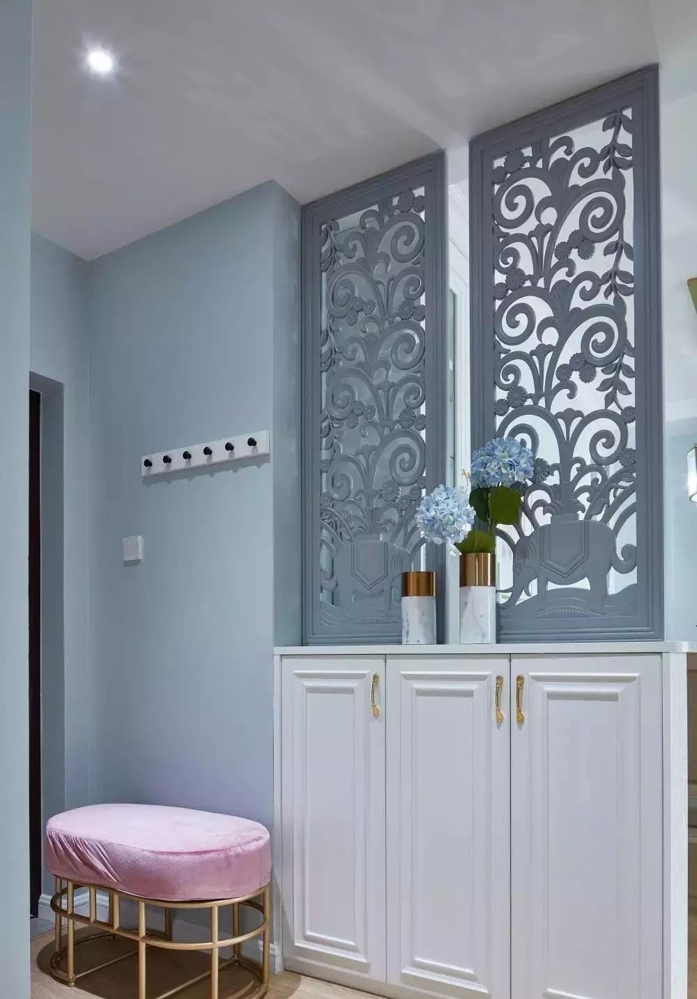 进门两侧都设计了收纳柜,白色定制柜镶嵌着精色的拉手,简约而不失精致感。左侧的半高收纳柜结合雕花屏风的设计,增加了空间的通透感。粉色+金色的换鞋凳是一抹亮眼的点缀。
