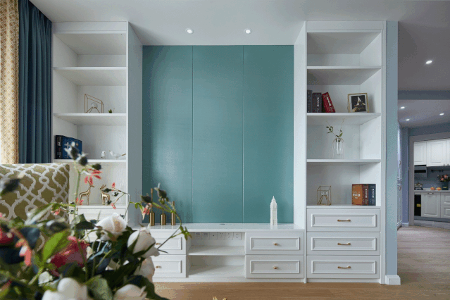 电视墙定制柜及适当的留空,不会过满,空间感更好,且收纳、展示功能兼具。