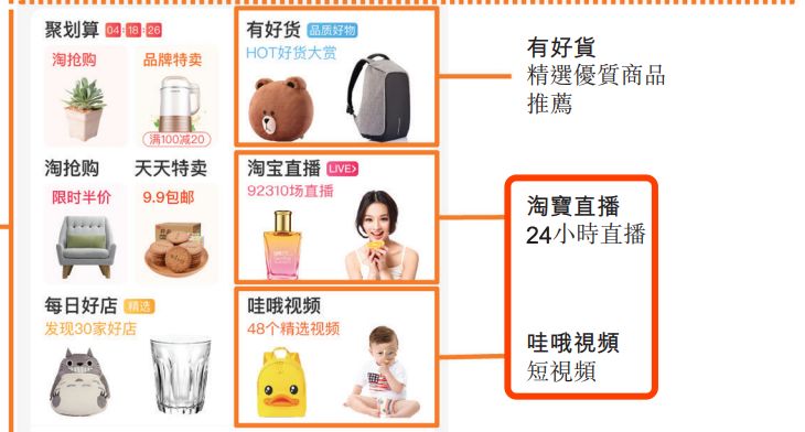 在最新版的招股书中,一个有意思的变化是,与2014年的淘宝界面相比,2019有两个突出的栏目为“24小时直播”和“哇哦短视频”。