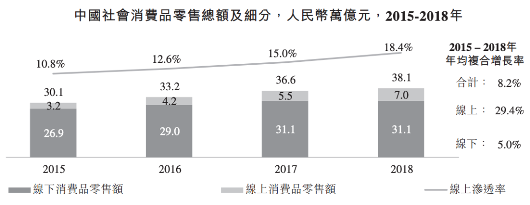 根据国家统计局的数据显示,2018年中国全国线上消费品零售额已达7万亿元,2015-2018年间年均复合增长率达到29.4%,线上零售已经成为零售市场增长的重要驱动因素。线上渗透率已由2015年的10.8%增长至2018年的18.4%。