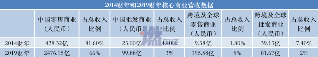 从两次招股书可以看出,2014财年中国电子商务的零售收入达428.32亿元,2019财年这一金额达到2476.15亿元,足足增长了568%,尽管仍然是占营收大头,但其占比逐年下降,近三个财年分别占比72%、71%、66%,阿里的批发业也有同样的情况。