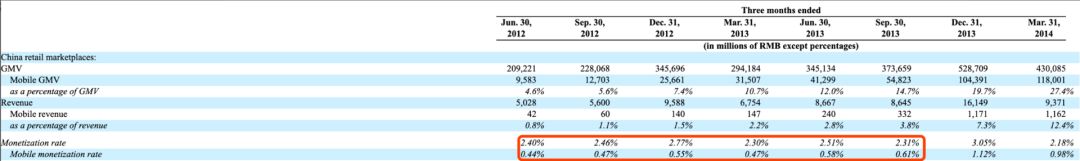 由上述招股书数据可以看出,在整个PC端向移动端过渡的时期,移动端的货币化率并不高。2013年9月以前,当整体的货币化率超过2%的情况下,移动端的货币化率长期停留在0.6%以下。