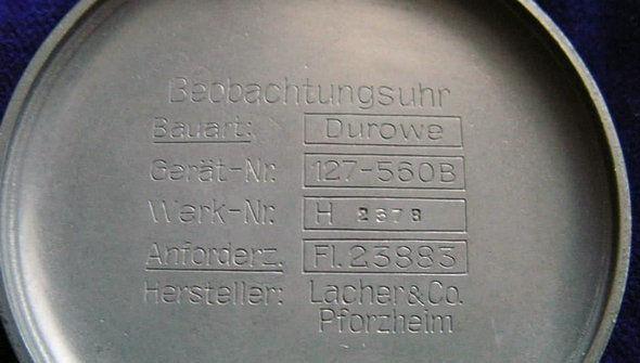 大尺寸使手表更加清晰易读,其表盘的黑色与白色的阿拉伯数字更加有助于精确读数的任务。 蓝钢剑形表针覆盖发光材料,12点钟位置有向上的三角形或箭头(A型表款只有两个点)。最初的A型只有一个外轨道纹,但后来B型(开始于1941年),有一个外圈为分/秒和小时内圈。每个表壳都有FL23883刻在左侧。FL指定flieger,23确定了手表作为导航手表。该表背曾在其内部有下列标识信息:类型(BAUART),生产序号(Gerät-Nr),机芯(Werk-Bez),订单号(Anforderz)和制造商(Hersteller)。 帝国空军部RLM及其钟表厂家合作伙伴生产的新颖设计,以后备受推崇。