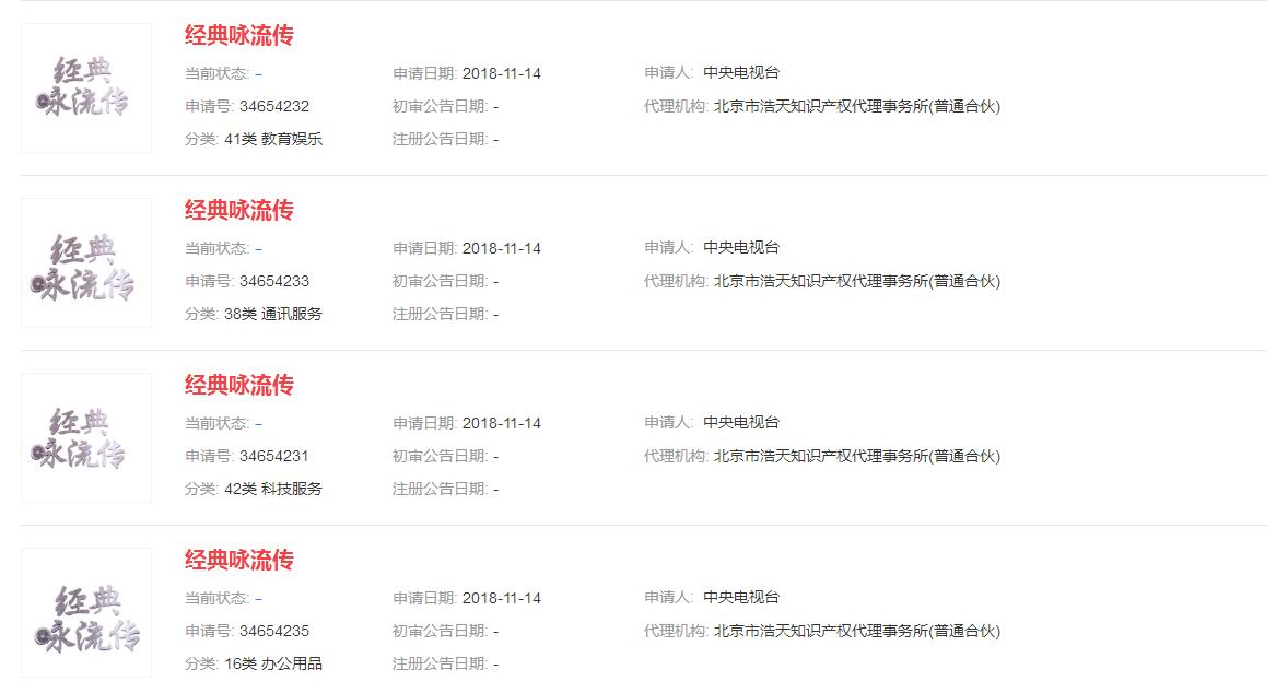 通过商标查询可发现,中央电视台在2018年11月14日提交了7件“经典咏流传”商标申请,虽然商标申请提交的时间比节目上线的时间晚了好几个月,但是好歹还是有注册,这已经是进步了。