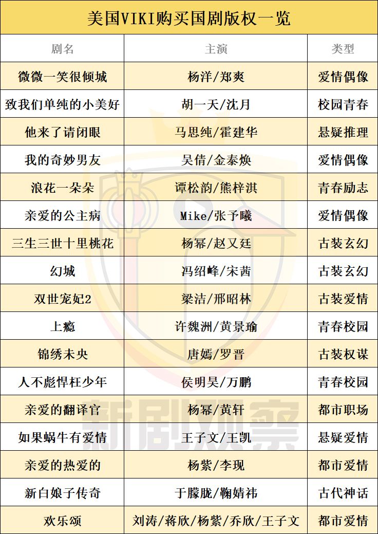 作为美国创办的主流视频网站之一,Viki也购买了多部脍炙人口的国产剧作品,其中包括《微微一笑很倾城》、《致我们单纯的小美好》、《他来了请闭眼》、《我的奇妙男友》等。