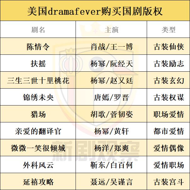 《三生三世十里桃花》和《扶摇》都在其购买之列,除此之外还有杨幂主演的《亲爱的翻译官》。国剧在Dramafever网站播出时,收视反响都不错,但大部分的观众都来自于亚裔,看来文化差异仍然是影像文化出海的壁垒。
