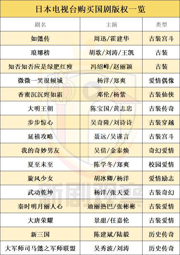 从购剧情况来看,日本非常喜欢古装题材的作品,在统计中的16部作品当中,仅有四部是非古装剧集。日本十分钟爱中国传统文化与经典剧集,比如《西游记》、《三国演义》都曾在日本被进行过改编和翻拍,虽然加入了日式喜剧的雷人成分,但是其恶趣味仍然风靡日本。
