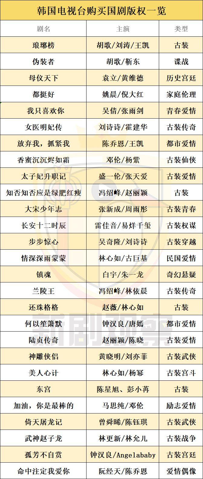 从购剧情况来看,韩国钟爱国产古装剧,不仅购买了近两年的热播剧《女医明妃传》、《孤芳不自赏》、《武神赵子龙》、《长安十二时辰》、《知否知否应是绿肥红瘦》、《大宋少年志》等电视剧,而且对于经典古装剧也极为偏爱,引进了《母仪天下》、《兰陵王》、《美人心计》、《还珠格格》、《神雕侠侣》等剧集。