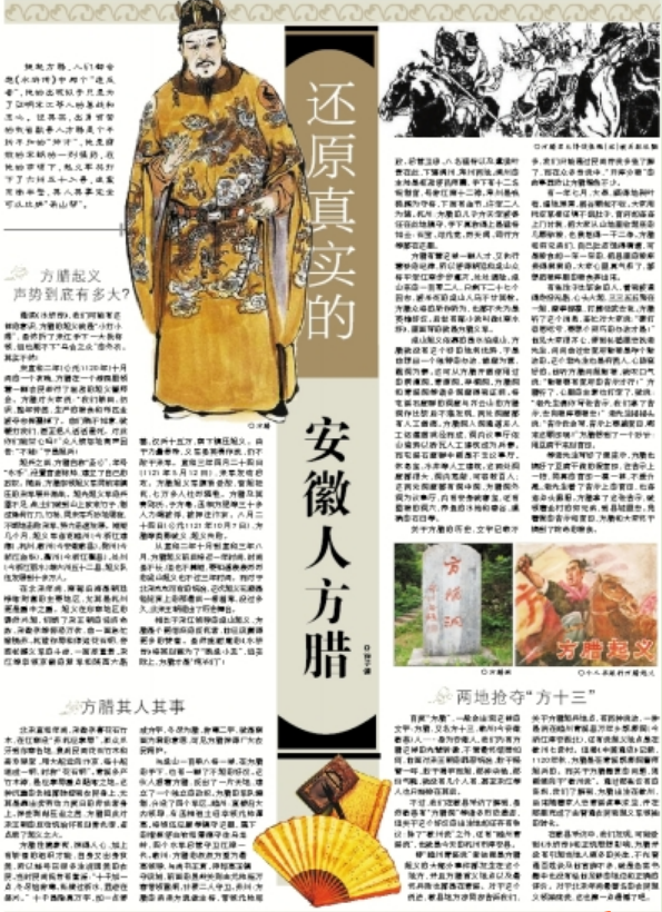 2011年,合肥晚报曾专门刊登《还原真实的安徽人方腊》,这篇文章列举了方腊作为农民起义领袖的事迹,还实地采访了方腊曾经到过的地区,也没有明确提出方腊于明教有什么关系,更不用说是明教教主了。