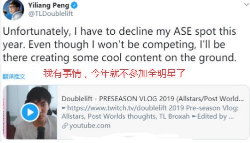 北美赛区观众投票选出的大师兄和比尔森两人都未能参加今年的全明星赛,比尔森因为队伍要去上海集训,这个时间刚好与全明星赛时间冲突,所以比尔森在推特宣布缺席全明星。