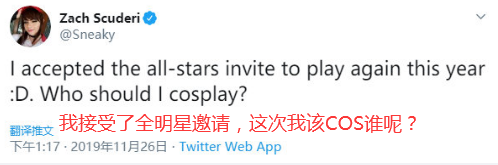 北美赛区除了Bang和Corejj直接参加全明星外,官方还邀请了Sneaky选手参赛,获得邀请资格的那一刻,Sneaky发推询问网友他参加全明星应该COS谁?