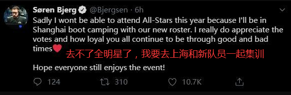 在比尔森宣布缺席全明星后,大师兄也在推特宣布放弃自己的全明星名额,具体原因不明,可能是大师兄临时有事。
