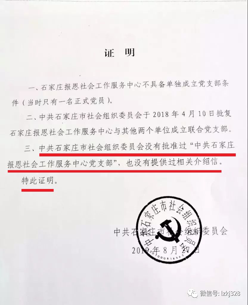 8月30日,公益时报发文称,石家庄市民政局方面表示,报恩社会工作服务中心的“中共石家庄报恩社会工作服务中心党支部”章为假章。石家庄市社会组织委员会还提供了相关证明,证明报恩社工中心不具备单独成立党支部条件。