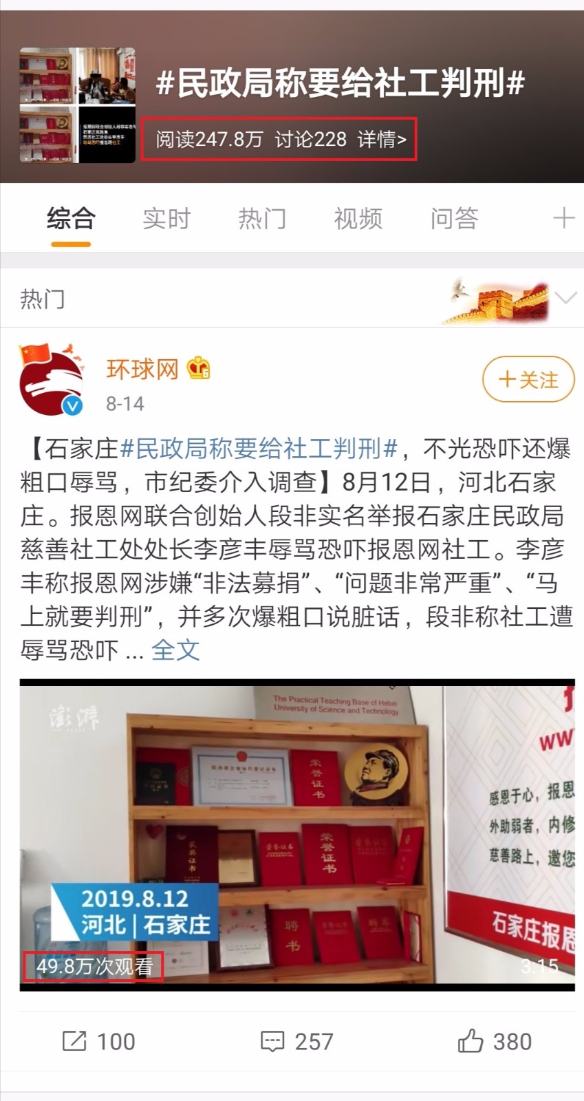 环球网官方微博发起的话题#民政局称要给社工判刑#阅读量达到247.8万人次,环球网官方链接的澎湃视频播放量超过了49.8万人次。