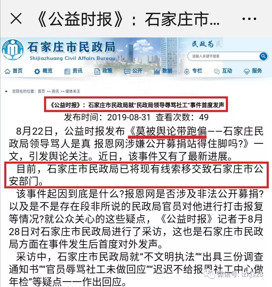 8月13日晚上,澎湃新闻通过多媒体平台发布《民政局称给社工判刑,石家庄市纪委调查》的视频新闻:8月12日,河北石家庄。社工组织(报恩网)联合创办人段非称石家庄市民政局工作人员辱骂恐吓社工,声称社工将被判刑并爆粗口。市纪委称该员工承认骂人,纪委已展开调查。