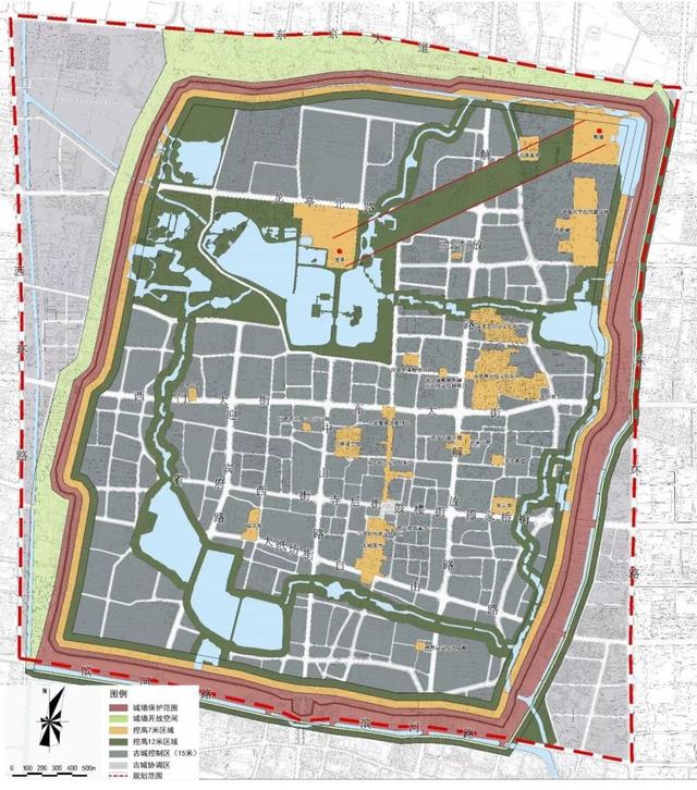 - 圈定古城保护范围:明清城墙内的13平方公里古城区