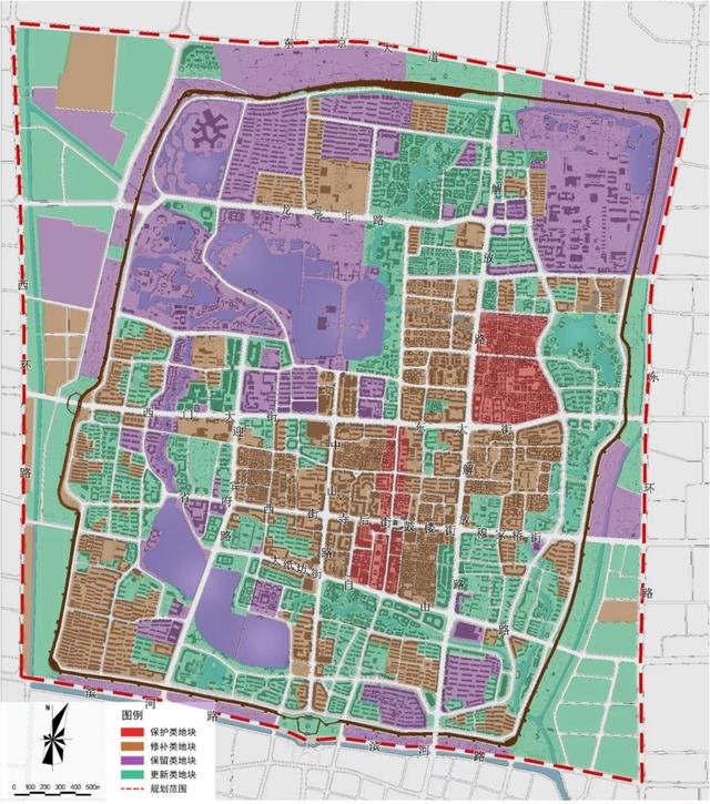 - 从保护修缮更新模式指引图中可以看出,红色区域是保护类地块,棕色区域是修补类地块,紫色区域是保留类地块,这三类地块只会在建筑原址上保护、修缮、保留,避免大拆大建。只有绿色区域是更新类地块,未来将根据古城建设发展需求,做适当的区域改造与更新。