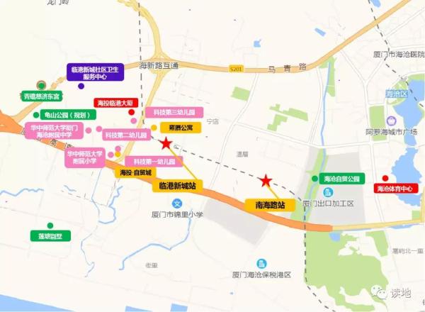 站点所在的临港新城已完成科技系、华中师大系两大品牌教育资源布局,建有华中师范大学附属小学、华中师范大学厦门海沧附属中学、科技第一幼儿园(原临港幼儿园)、科技第二幼儿园,未来还将建设科技第三幼儿园,上述四所学校均已建成招生,形成了完整的一站式教育链条。