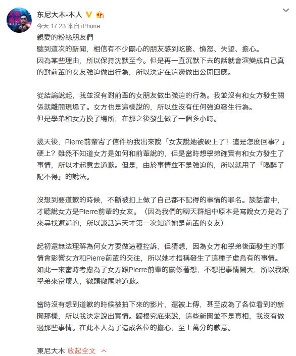 27日晚,日本男优东尼大木发文就此前被Pierre前辈指控性侵其女友一事说明情况,他称“我并没有对前辈的女朋友做出强迫的行为。我并没有和女方发生关系就离开现场了。”