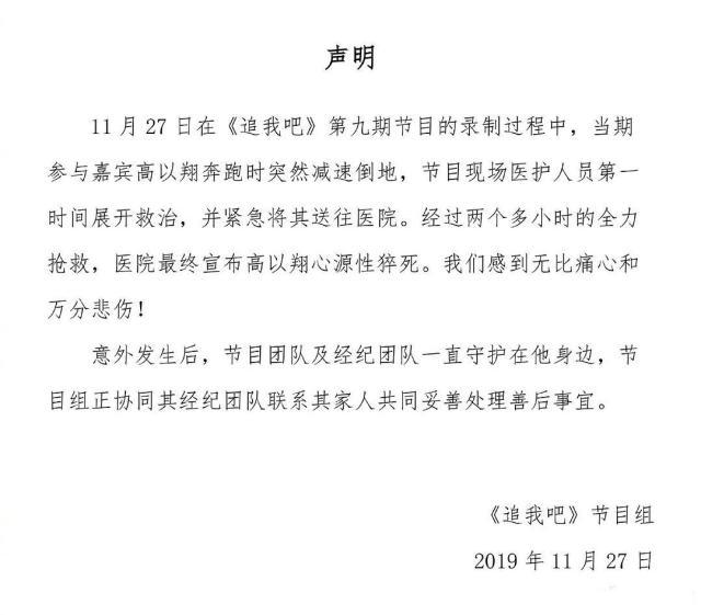 在高以翔的事情发生之后,《追我吧》节目组的一纸声明也是完全没有反思的意思,为何会错过抢救的黄金四分钟,在一同参加的嘉宾黄景瑜奋力找人搭救之后也没有及时给予治疗,这应该是节目组应该思考的问题,而不是一份不痛不痒的声明。