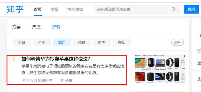 可能是因为这一话题备受网友专注,"如何看待华为抄袭苹果这种说法?"这个问题在今天甚至登上了某乎的热搜榜第一。