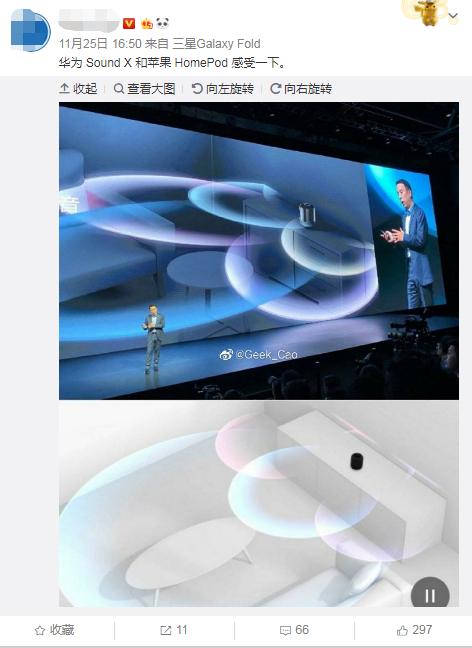华为Sound X音箱发布后,有网友发文指其演示效果也和苹果homepod有点类似。