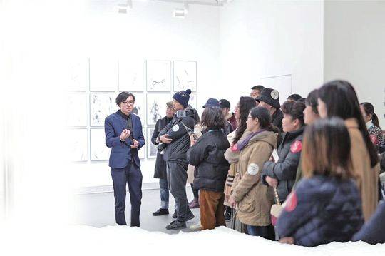 李杰在“回路——2000年以来的西南影像实验”现场导览麓湖美术馆。