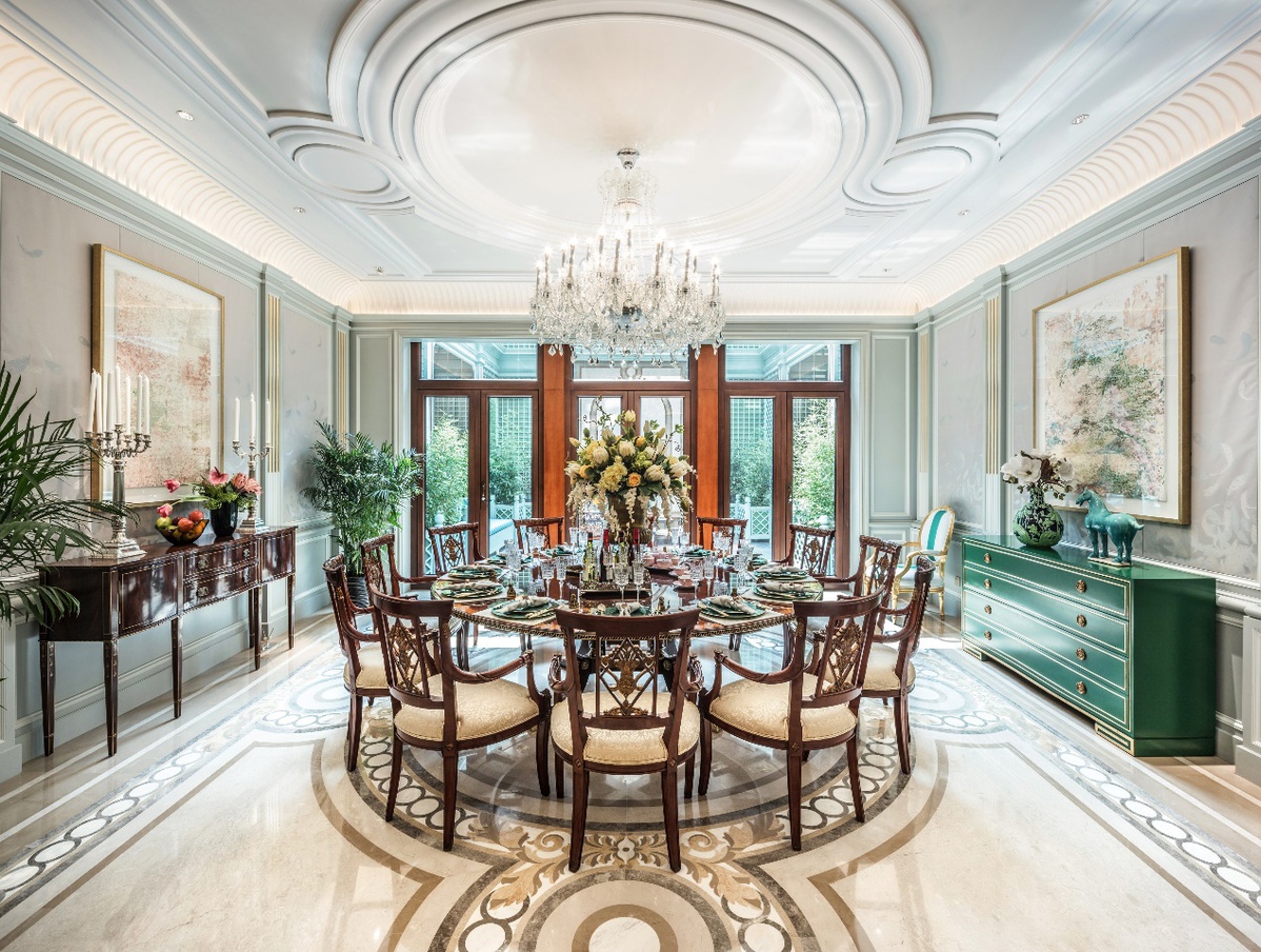 例如,在合院的前厅设计中,以法式风格的经典轴线,对称的边几,繁复奢华的花纹与墙面装饰简单大方的造型相统一。客厅则是大面积白色调为基底,大尺度、大面宽、4.5米高的穹顶,空间多用大型物件装饰,让典雅的法式空间少了一些束缚,多了几许恬淡的跳脱。
