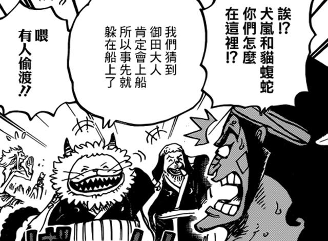 犬岚和猫蝮蛇是最轻松的登船成员。这两位认为御田最后肯定能登场,所以事先就躲在船上。为何猫狗可以上船,这毫无疑问是马尔科放行的。从之前马尔科和两人谈论海上岛屿数量、吃饭还靠一起,就看出三人很合得来。
