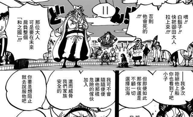 御田是最惨的一位。御田身份是和之国王族,在加上不屈居人下的可能,白胡子是直接拒绝的。但御田出海的愿望何其强烈,使用锁链吊在海贼船,就是要上白胡子的船。被御田的坚持和决心打动的白胡子,定下了三天之约。