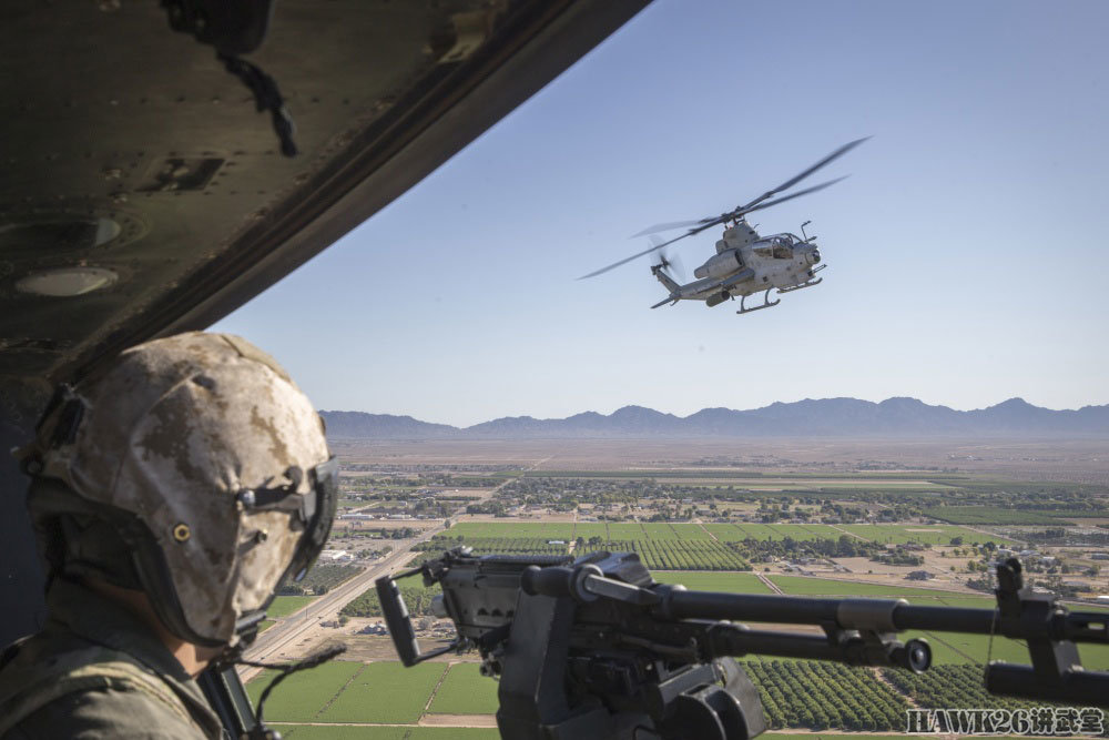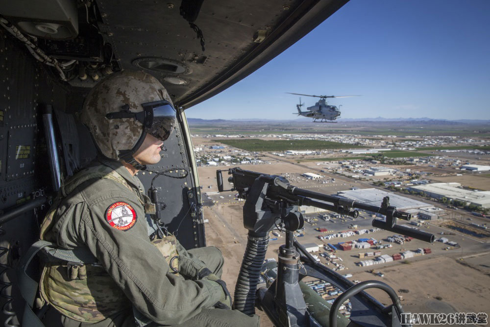 UH-17机舱左侧的舱门机枪手,此次训练使用的是实弹,所以大家都非常小心谨慎。不远处就是编队飞行的AH-1Z“蝰蛇”武装直升机,他们将联合对目标区域发动攻击。