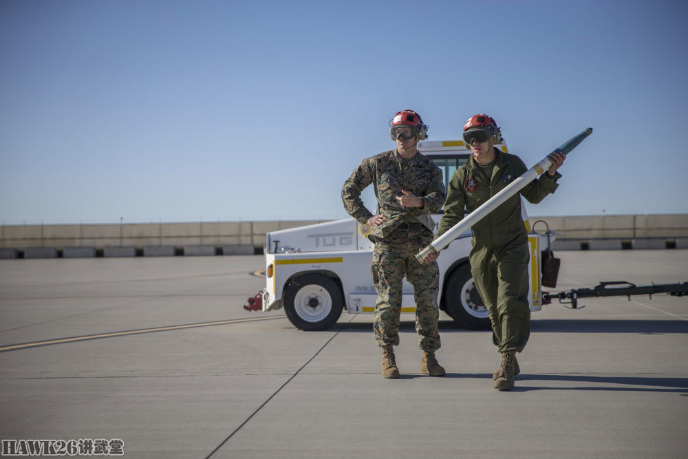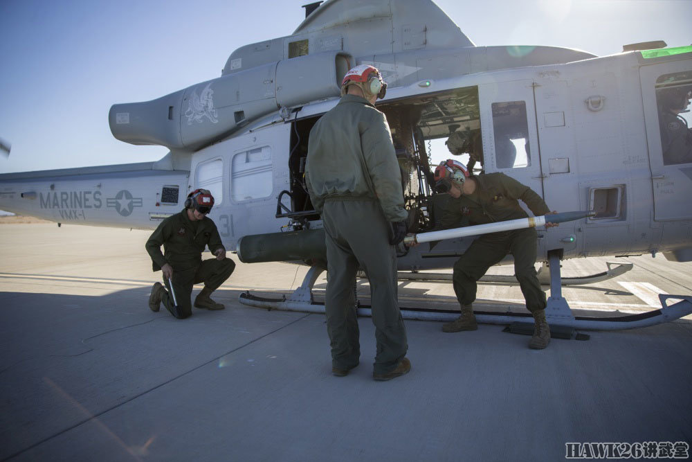 地勤人员举着70mm火箭弹准备为UH-1Y装弹。