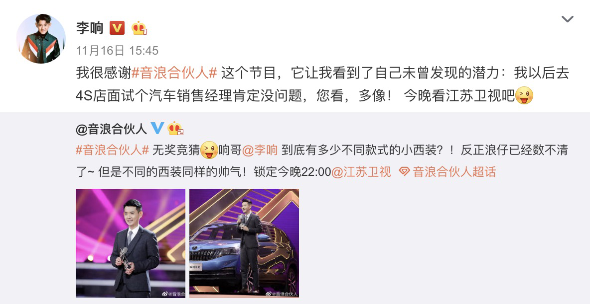 当然这只是机智的李响以开玩笑的形式为《音浪合伙人》做了一波巧妙的宣传,原来响哥要当汽车销售经理是假,力争敬业宣传小能手是真啊!