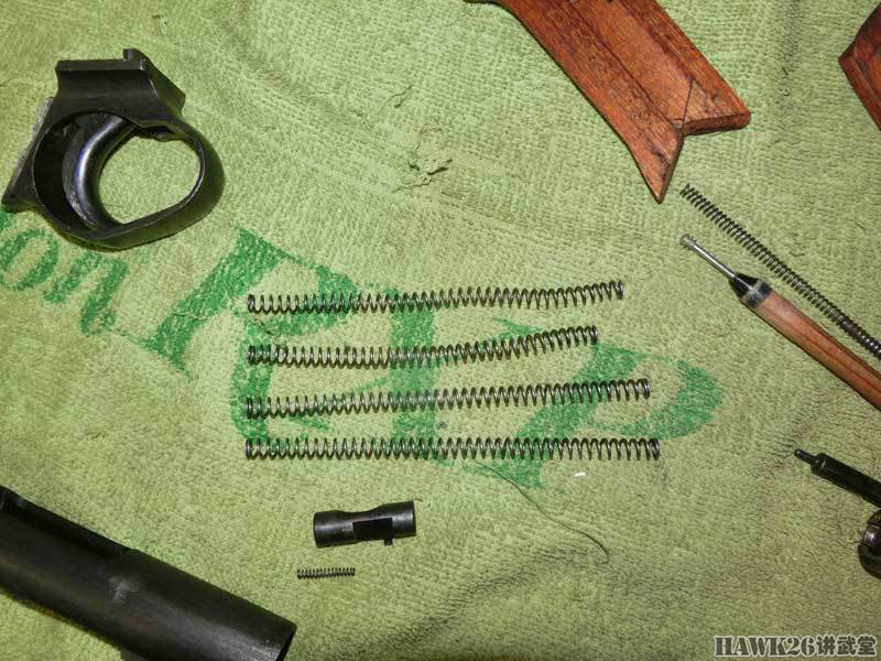 这是复进簧的对比,上面两根为早期型,下面两根为后期型。早期型的复进簧制造工艺不佳,会有弹性衰减和横向变形,而中后期制造的弹簧质量有了明显提高。所以大正十四年式手枪早期型的复进簧弹性不够,而中后期型却好得多。欧美手枪制造工艺有一个从精良到简化的趋势,而日本正好相反,制造工艺的提升使得后期型的可靠性比早期型更好。