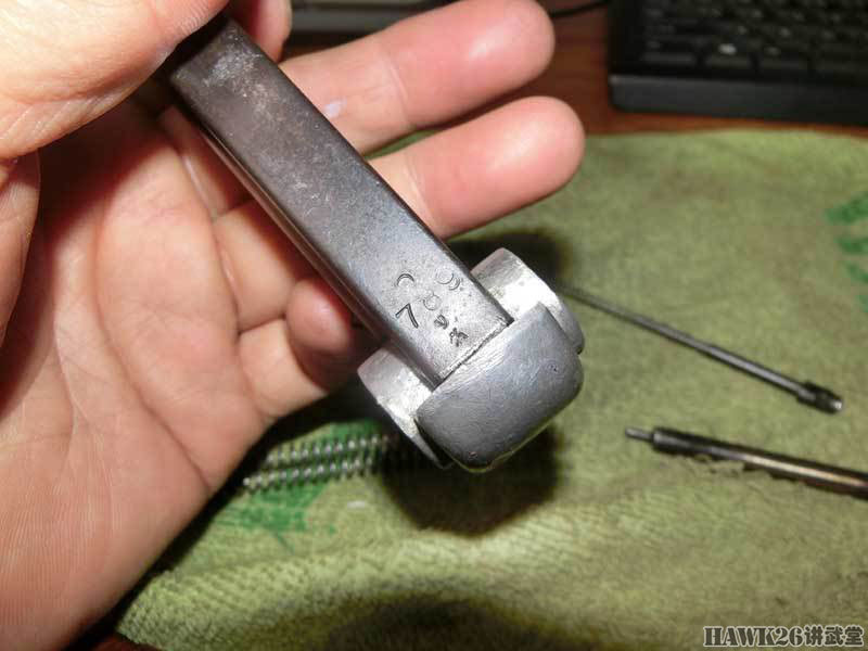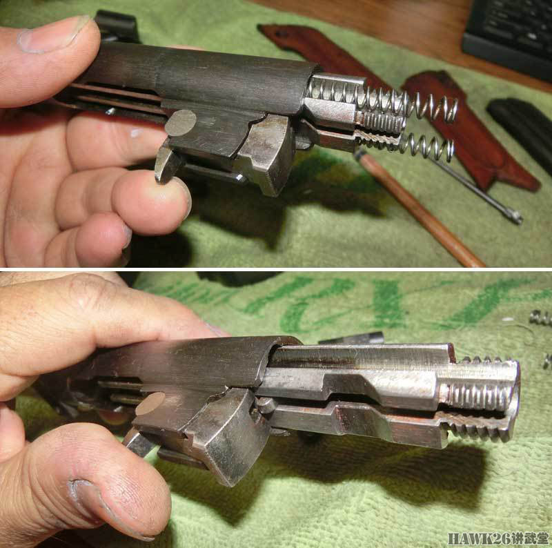 尽管外表粗糙,但枪机内部加工也还算合格,只不过装配实在是成问题。大正十四年式手枪配备两根复进簧,位于枪机左右两侧,这种设计与现在的手枪完全不同。